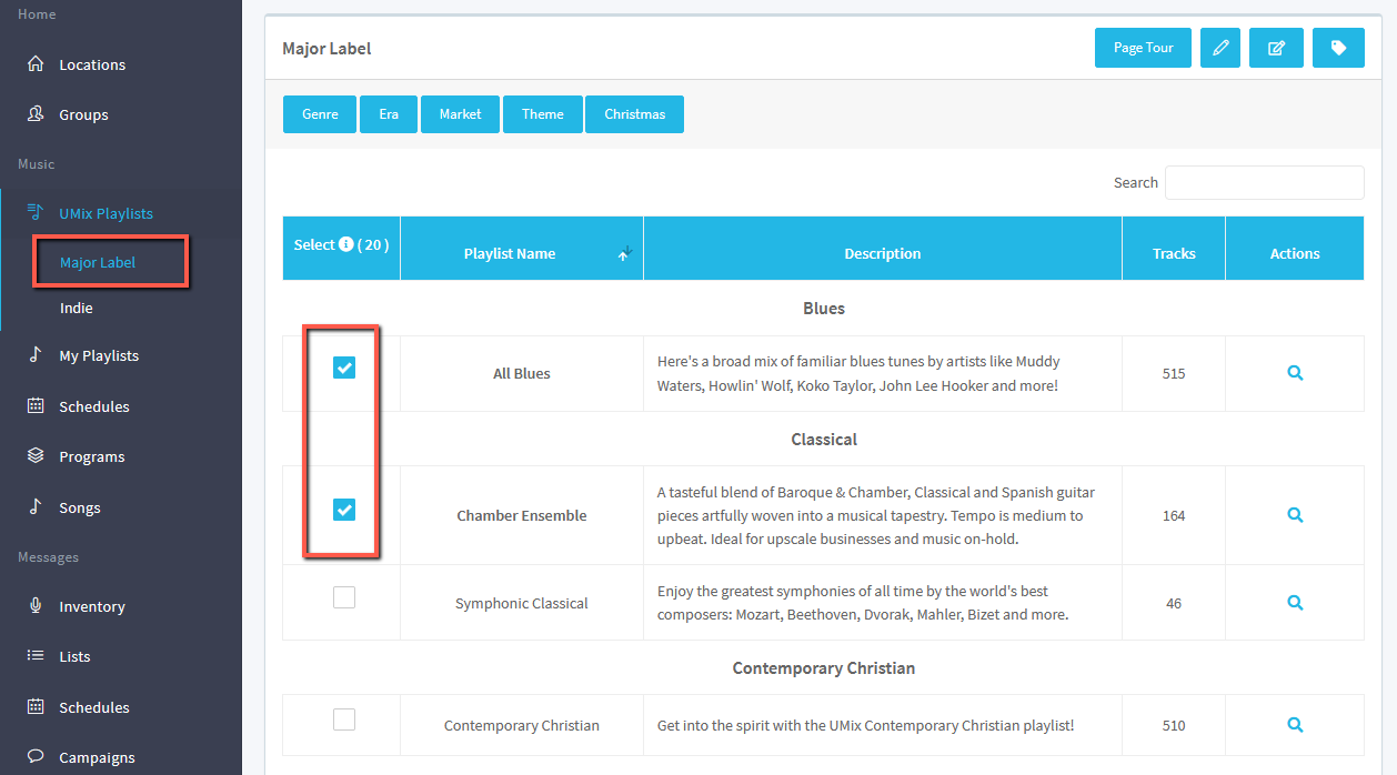 UMix Playlists are playlists that we create and maintain. Some include songs only by major label artists, some are indie only, and still others contain a combination. Below we show the Major Label tab (left side menu). Main categories on the top of ...